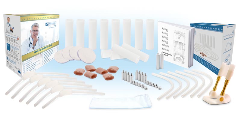 Andropenis Gold + Kit Accessori = 1 Estensore del pene di oro 24K coperto + 20 Andro-aste + 12 Andro-tubi + 12 Andro-bande + 6 Andro-anelli + Libro delle istruzioni + E-book sulla salute sessuale + 1 Borsa da viaggio